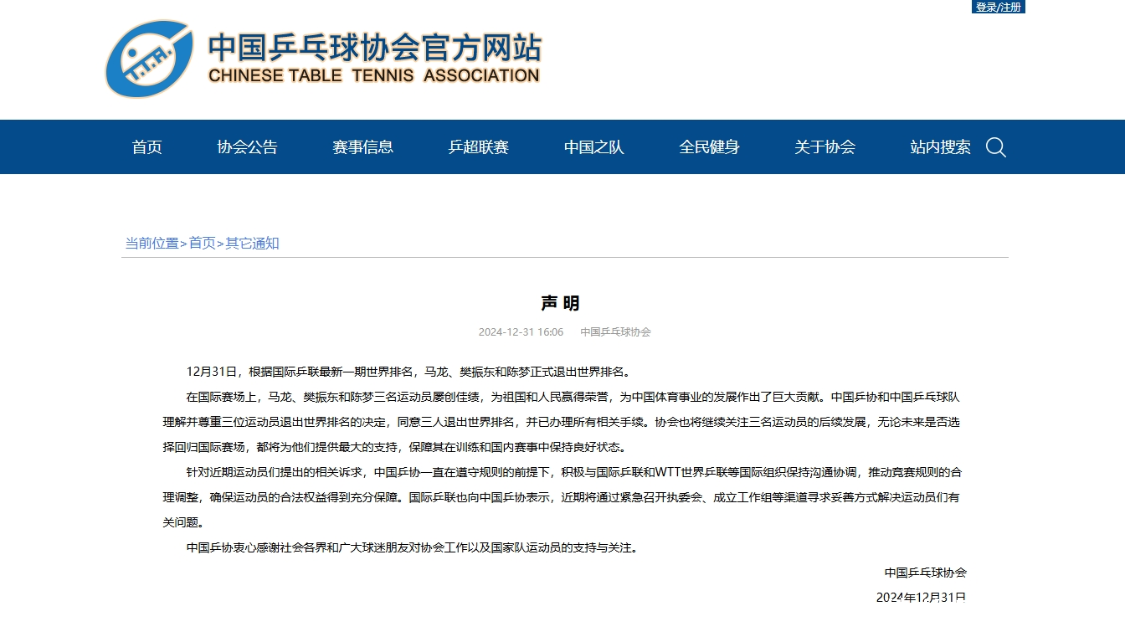 点击输入图片形容(最多30字)不外,樊振东和陈梦两大奥运冠军的退出,中国乒协和刘国梁均莫得在第一时分进行复兴。而在事情过了几天后,中国乒协和刘国梁终于就国乒主力球员退出天下排行一事进行了公开的复兴。中国乒协暗意:“相识并尊重三位阐明员(马龙、樊振东、陈梦)退出天下排行的决定,答应三东谈主退出天下排行,并已办理统共相关手续。协会也将继续关注三名阐明员的后续发展,无论将来是否摄取回回外洋赛场,齐将为他们提供最大的复古,保险其在历练和国内赛事中保握细致气象。”另外,中国乒协还暗意,他们正积极与外洋乒联和WTT天下乒联等组织进行疏导,但愿大略鞭策竞赛限定的转机,并确保阐明员的正当权益。