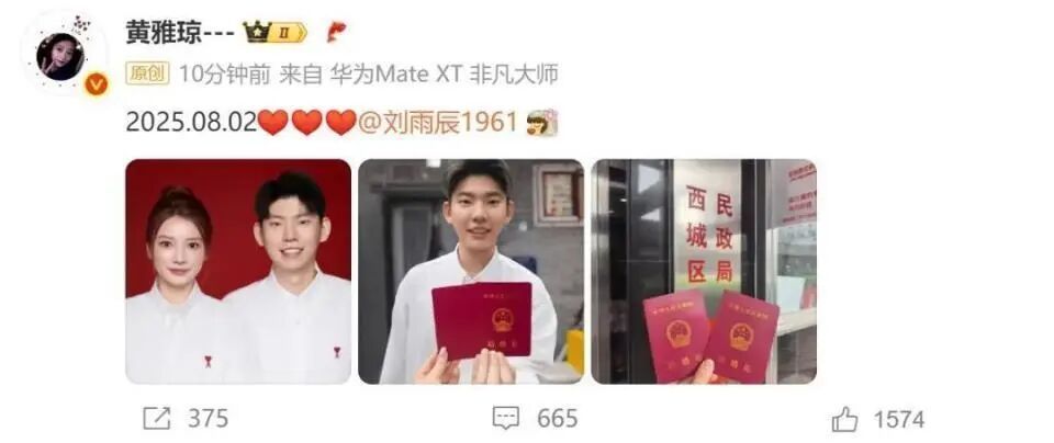 据此前报谈,8月2日,羽毛球名将黄雅琼与刘雨辰在13:14晒照官宣领证成婚。