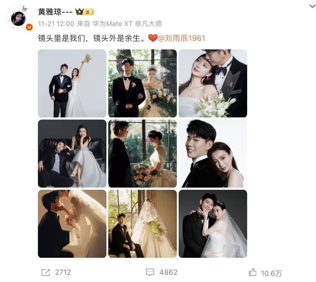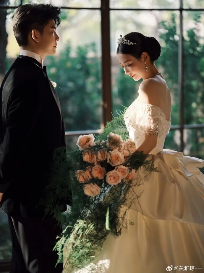 11月21日,黄雅琼在酬酢平台发布两东谈主婚纱照。