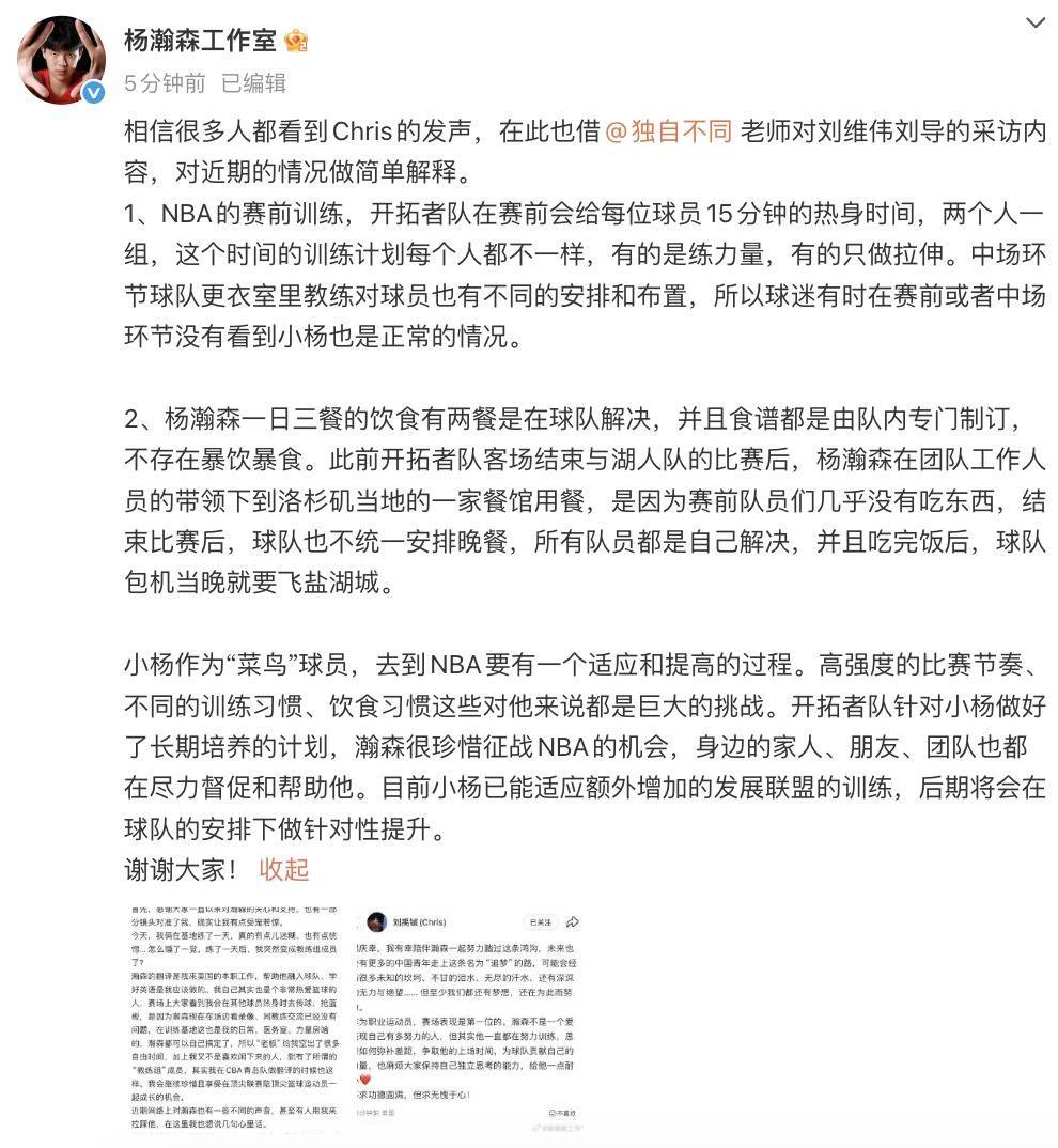 11月5日,据白鹿视频报谈,@杨瀚森职责室 发文恢复杨瀚森近期争议。