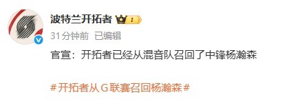 12月6日,波特兰迷惑者队官方告示,将杨瀚森从发展定约下属球队扯破之城混音队调回。